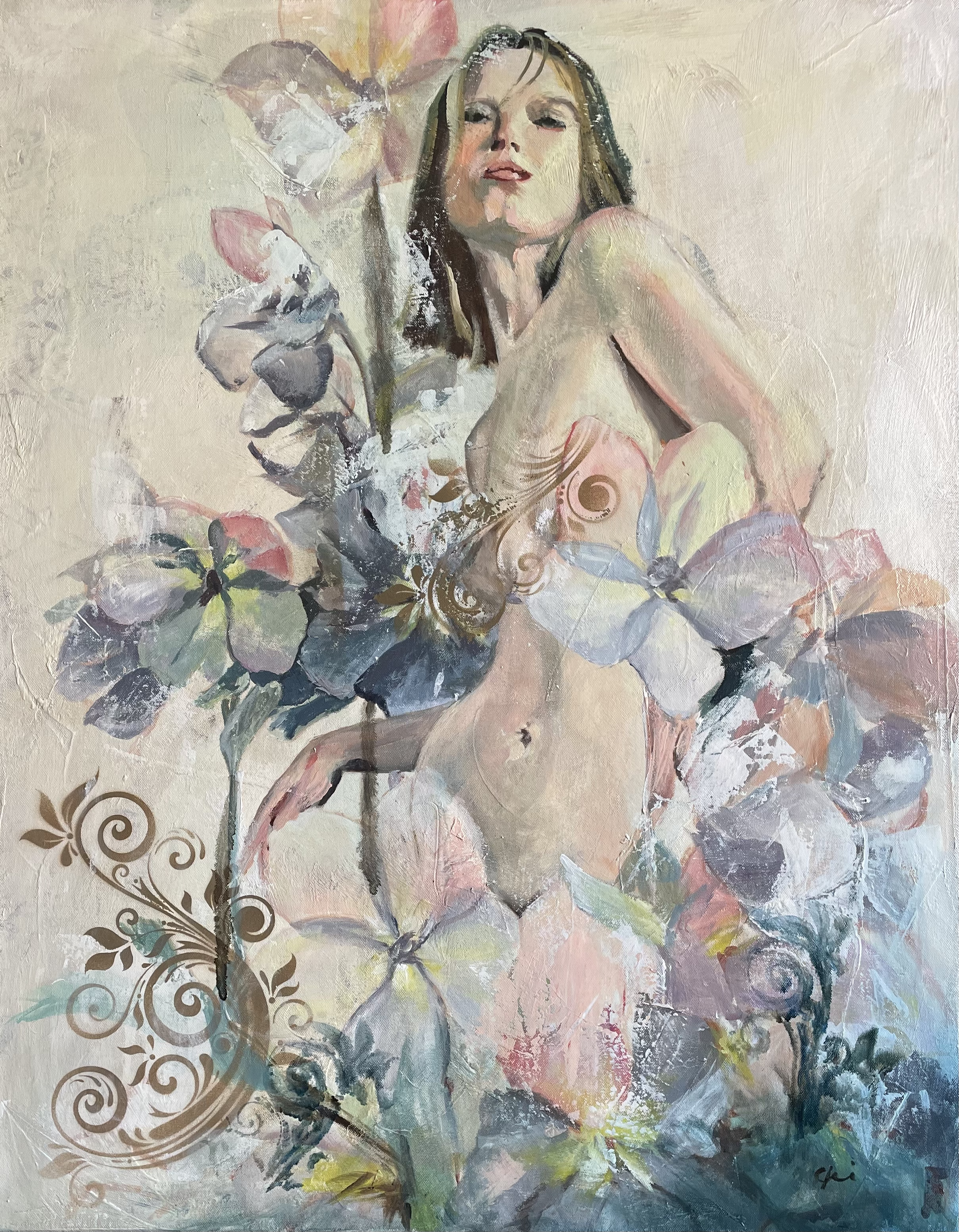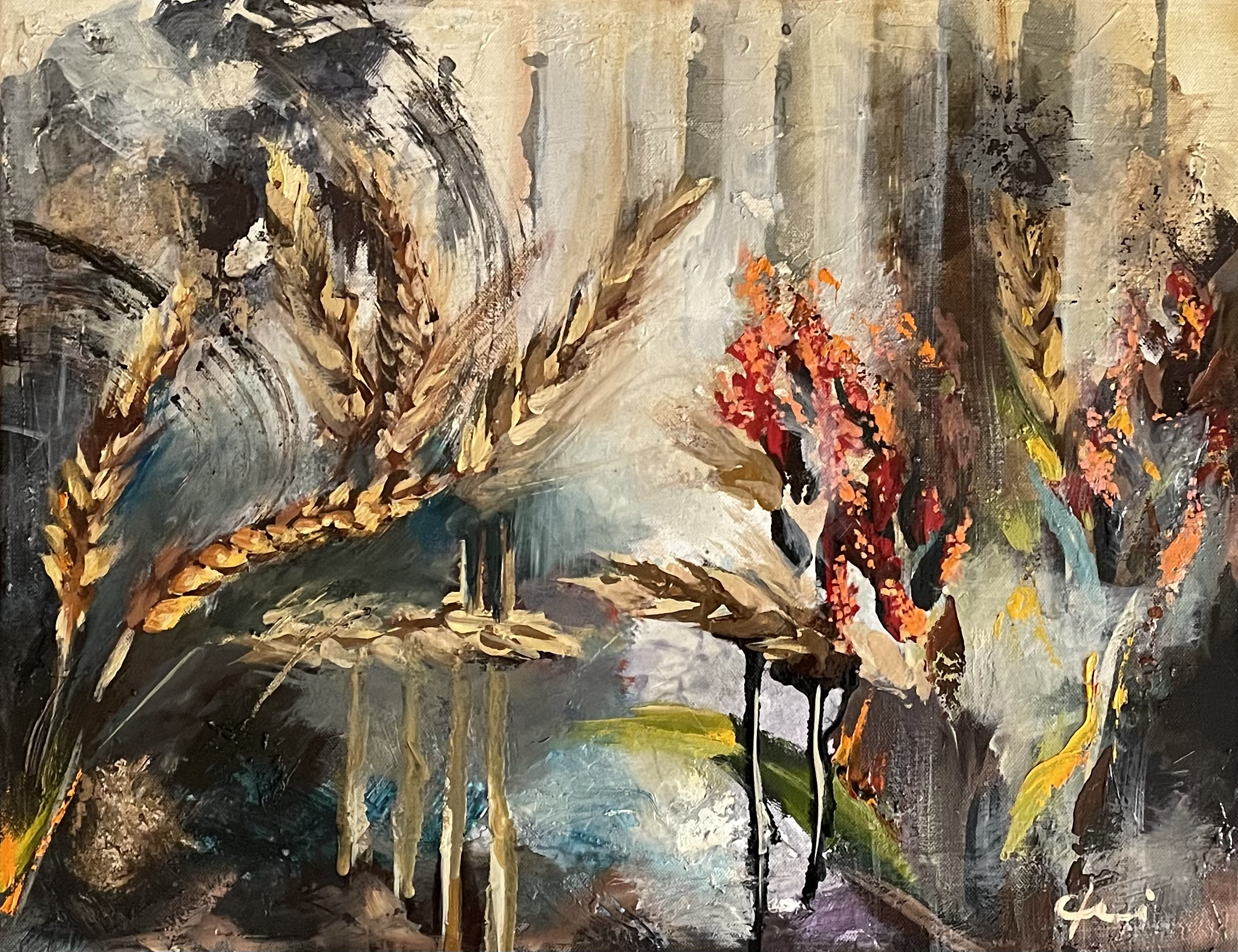 While I love my ladies, I also love nature in general. Often I will see moments that I just have to capture. The contrast of the red sorghum and the creamy wheat growing wild together along the side of a country road was one of those moments. With a dramatic mixed media background I think it’s a lovely representation of natures many moods and the moments of joy we can find no matter how volatile the environment.